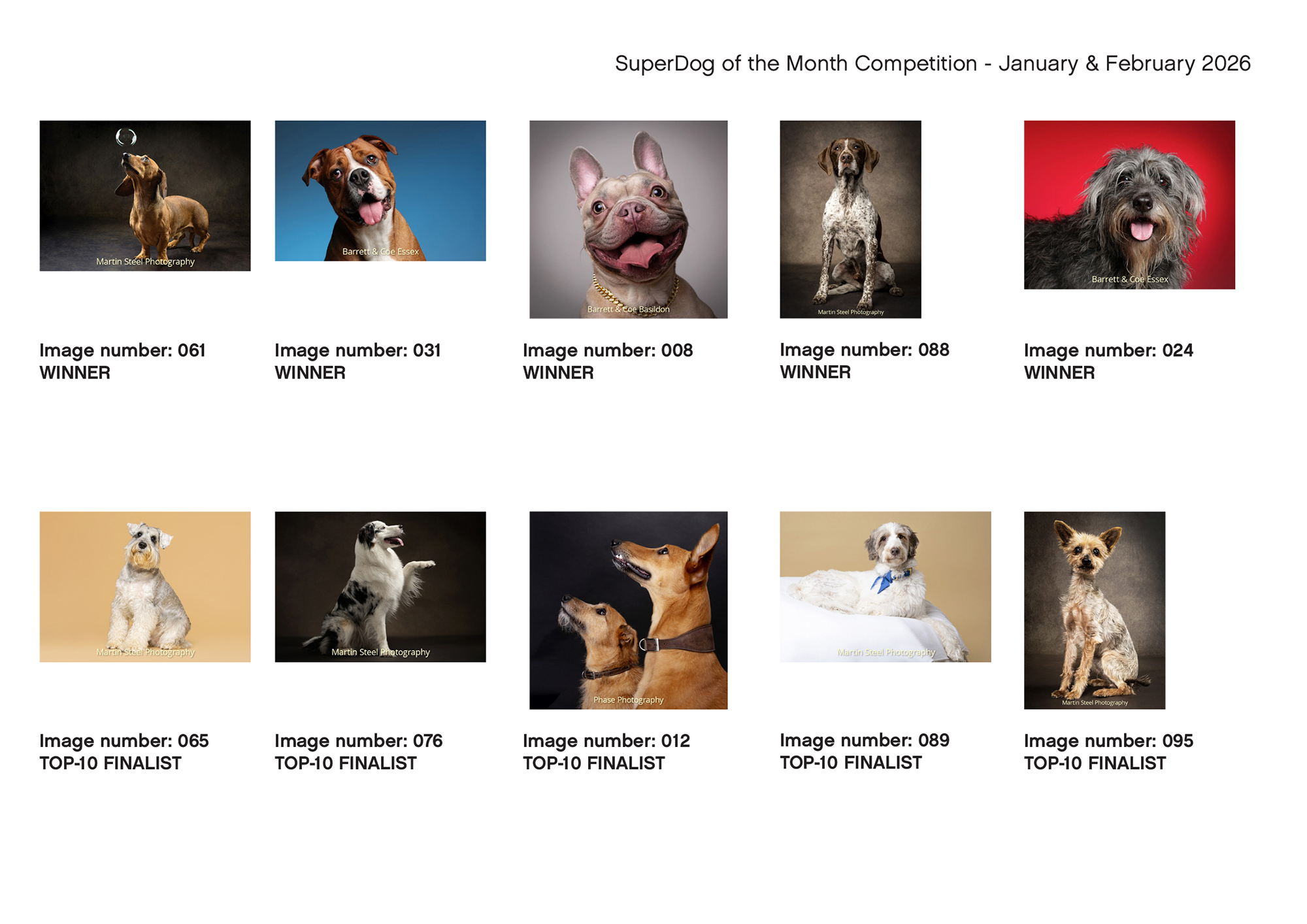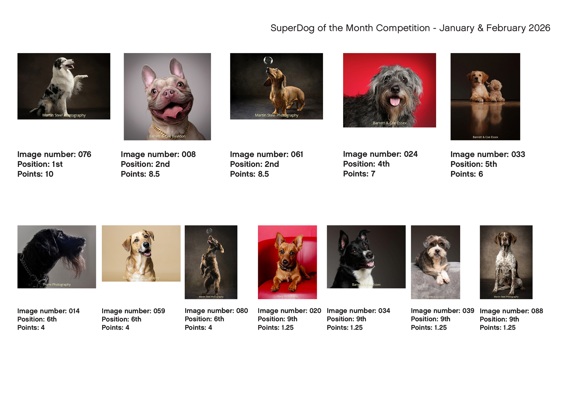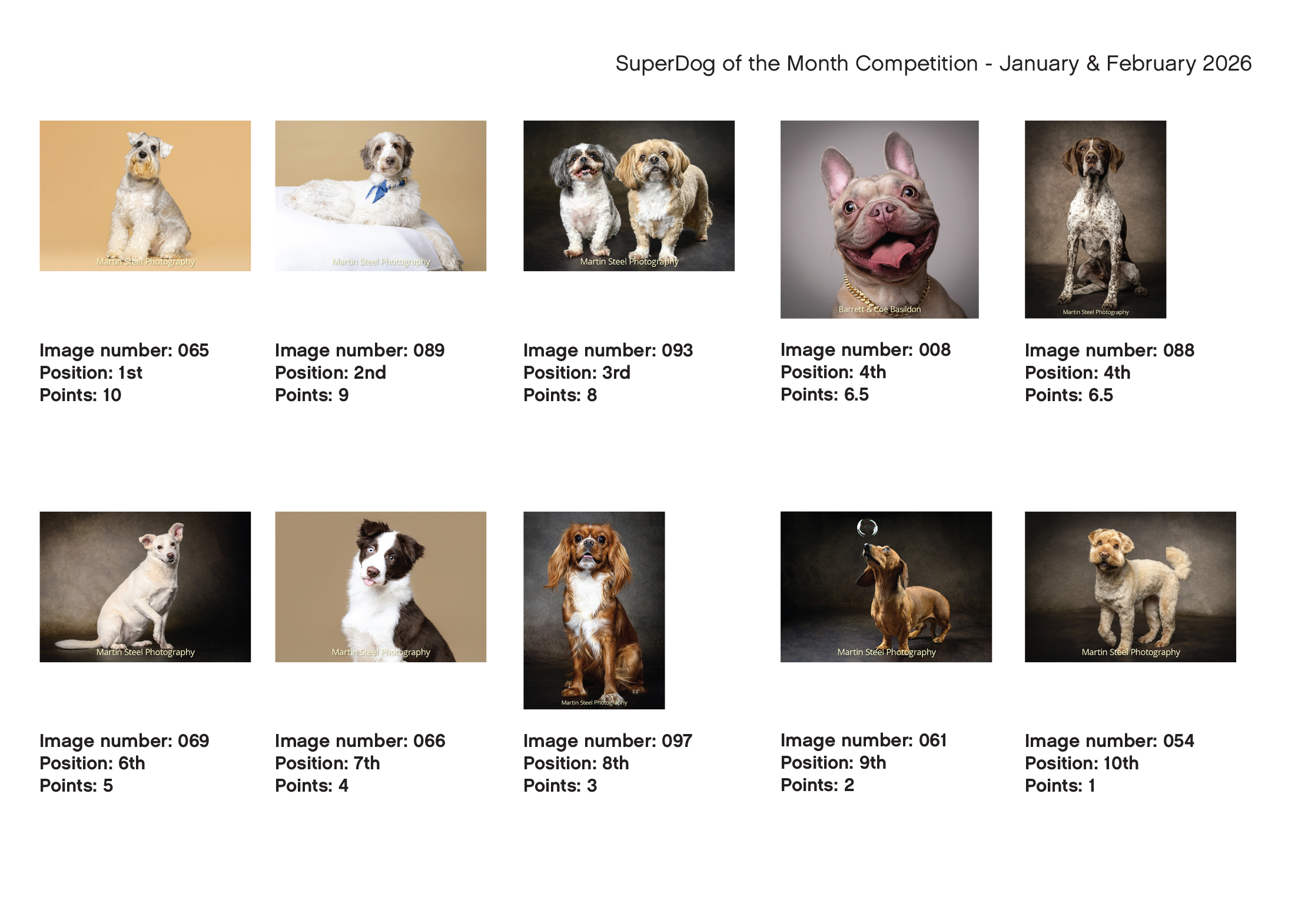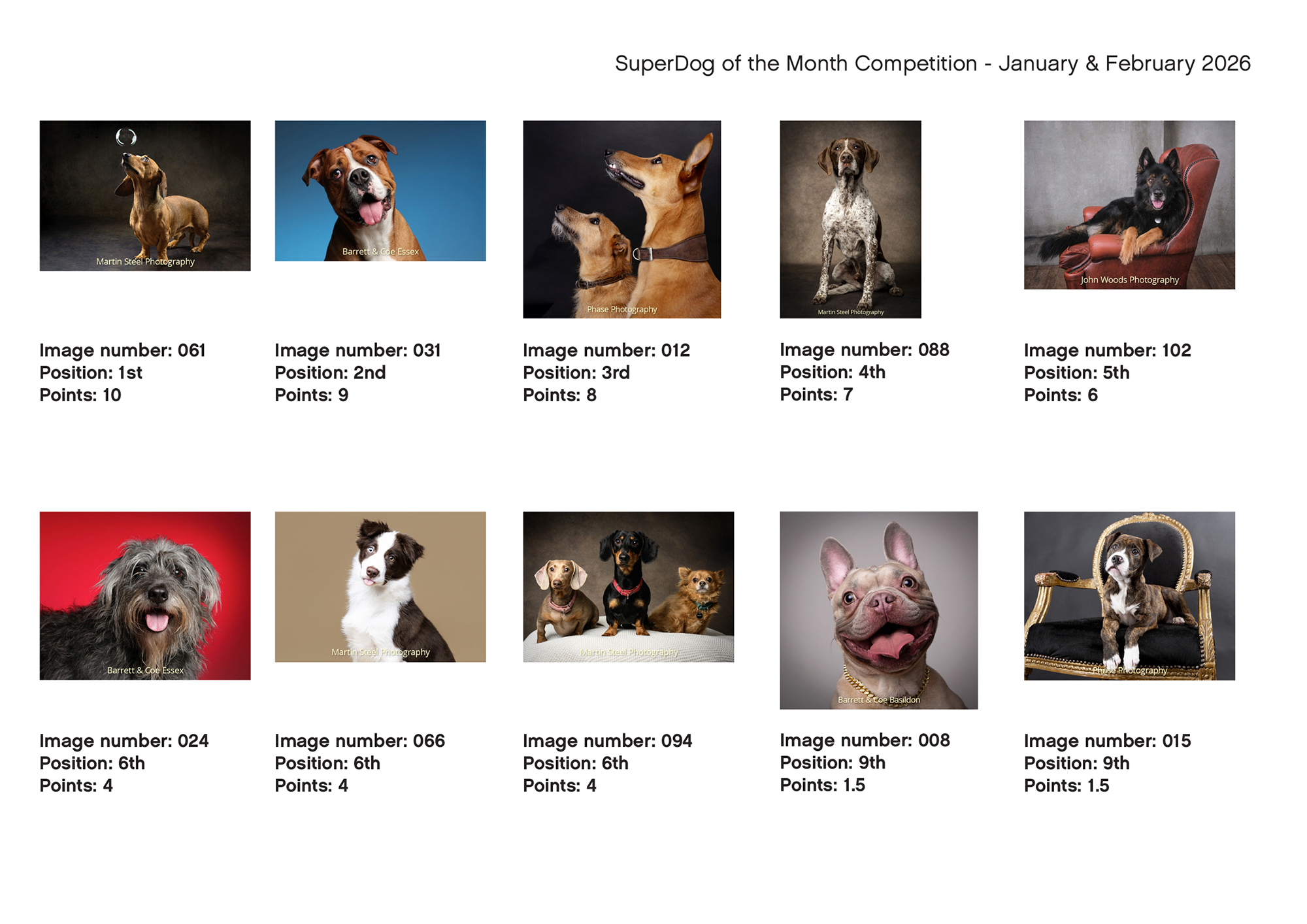 SuperDog of the Month January and February 2026 Scoring Top 10 Public Votes Top 10 Photographer Votes Top 10 Dog Owner Votes Top 10 Sponsor Votes Overall Top 10 Please Share This Share
